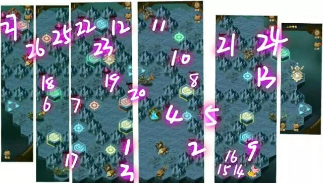 重难点汇总:初看关卡数量不少,可能会有点失望,但实际需要挑战的关卡比鸦巢要少一些,这和它的难点设计有关:每隔一关,每条路线上的方块就会减少1个,打到最后基本就无路可走了。不过最终的“浮岛”有2个,所以由此能得出结论——想一次通关是不可能的,至少得打2次,这还是在只拿最终宝贝的前提下。在仅获取2个最终宝贝的情况下,你只需击败图中标注序号的野怪就行,而序号的顺序就是你的攻略顺序。分两次挑战时,首先要选择颜色,绿色或者蓝色,比如选了蓝色,那这次挑战就只能走有蓝色构造的通道,开启3个构造后,中心会出现一个传送阵。点击传送阵后,走绿色线路会进入上方浮岛,最终宝贝是雪米拉;走蓝色线路则进入下方浮岛,最终宝贝是艾雅苏醒之佑的碎片。剩下的零碎福利只能重新启动挑战,然后清理每条带宝贝的支线,不过从某种程度来说,支线可能比绿、蓝两条主线更难……