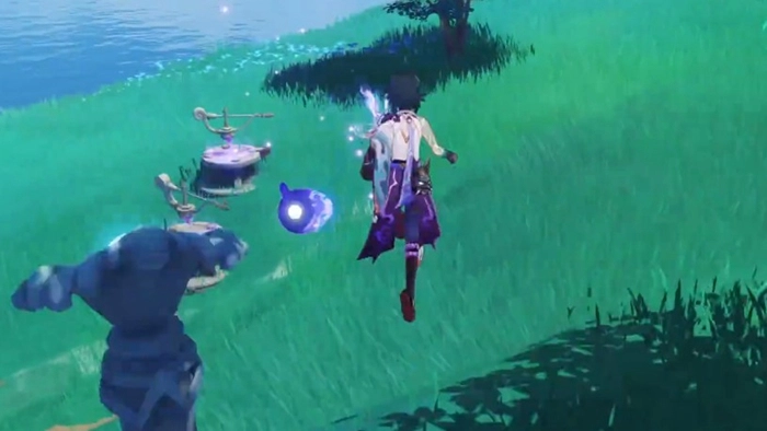 当然啦,如果大家没有雷种子,直接跑到右边的雷灵旁边靠近它,我们身上也会出现感电效果。这时候再回到正确的位置,一样能完成这个指针解谜。这样一来,我们就能搞定曚云神社的指针解谜,拿到华丽的宝箱了。