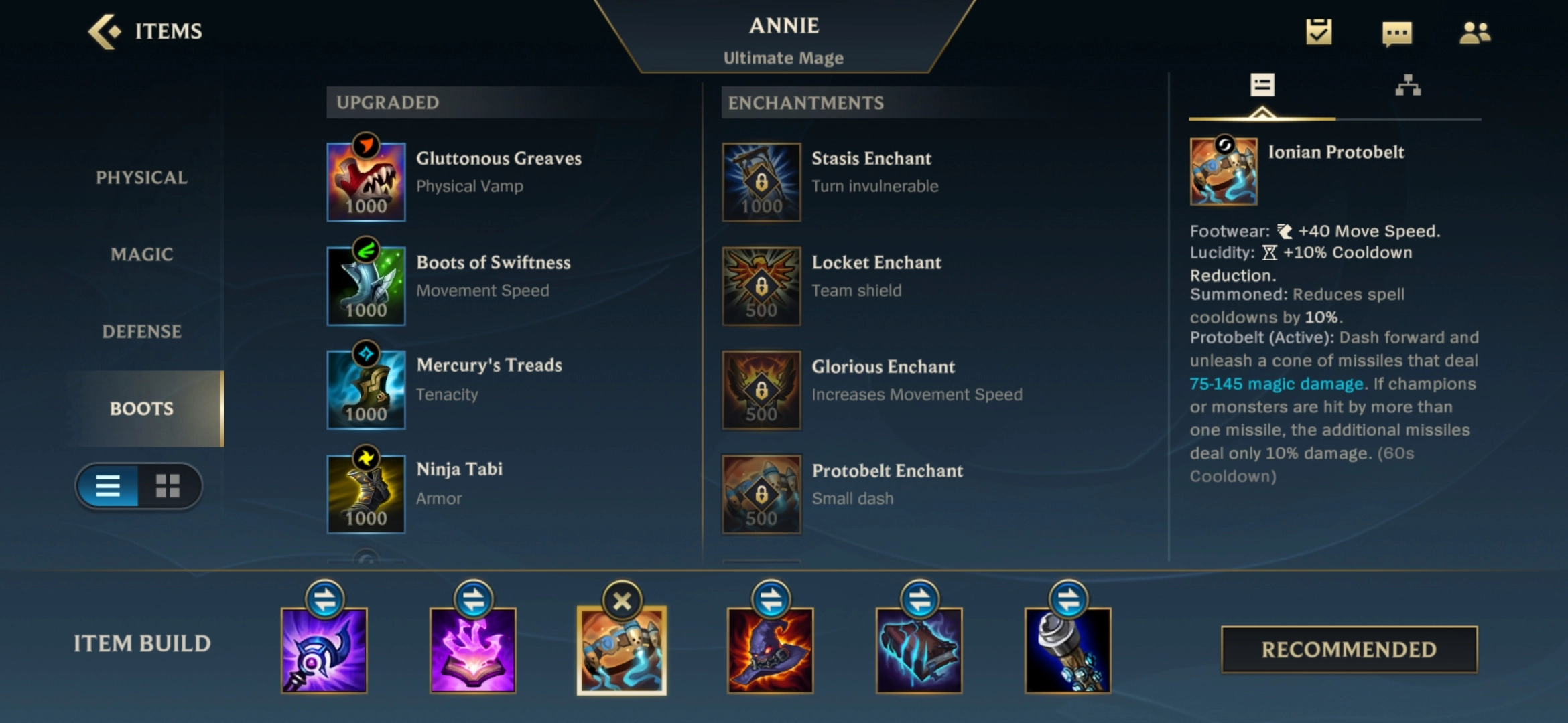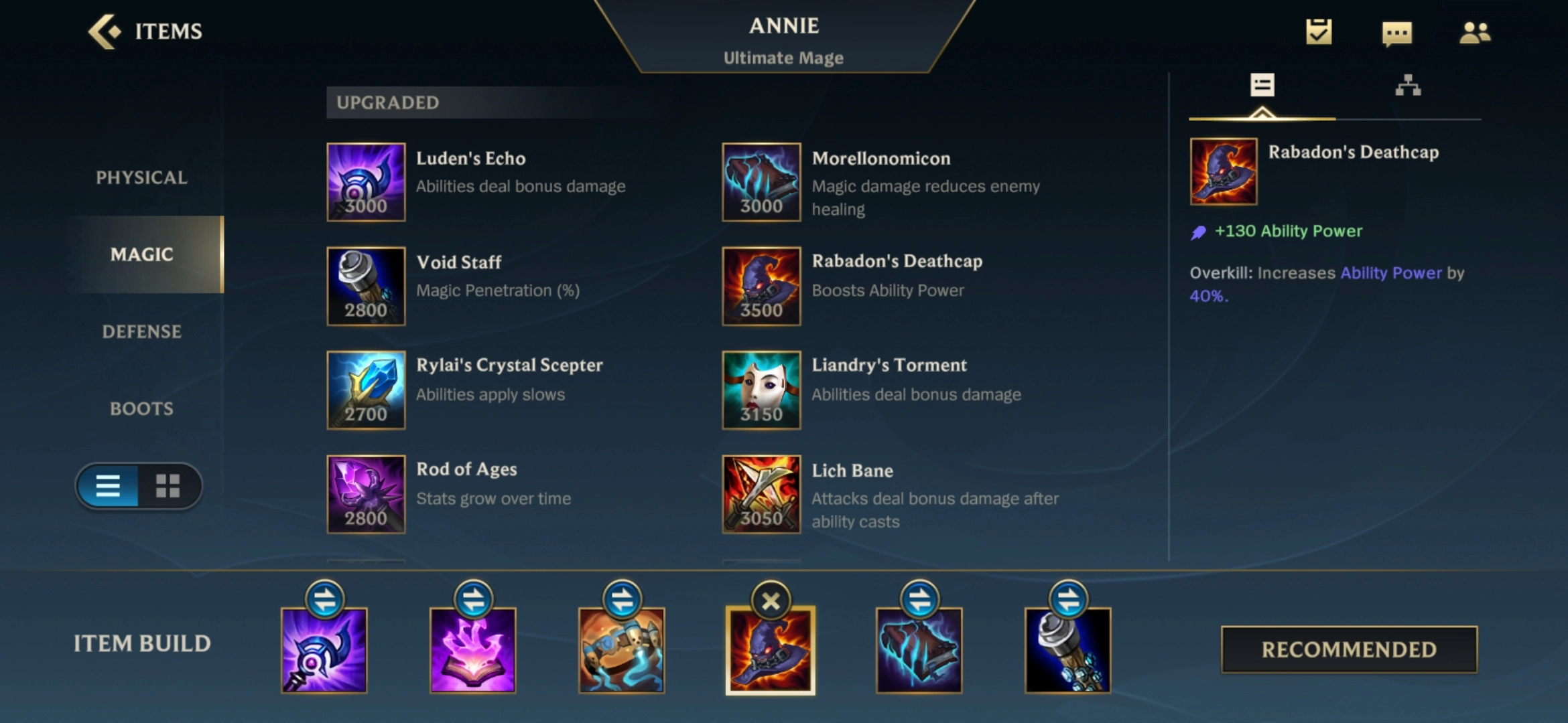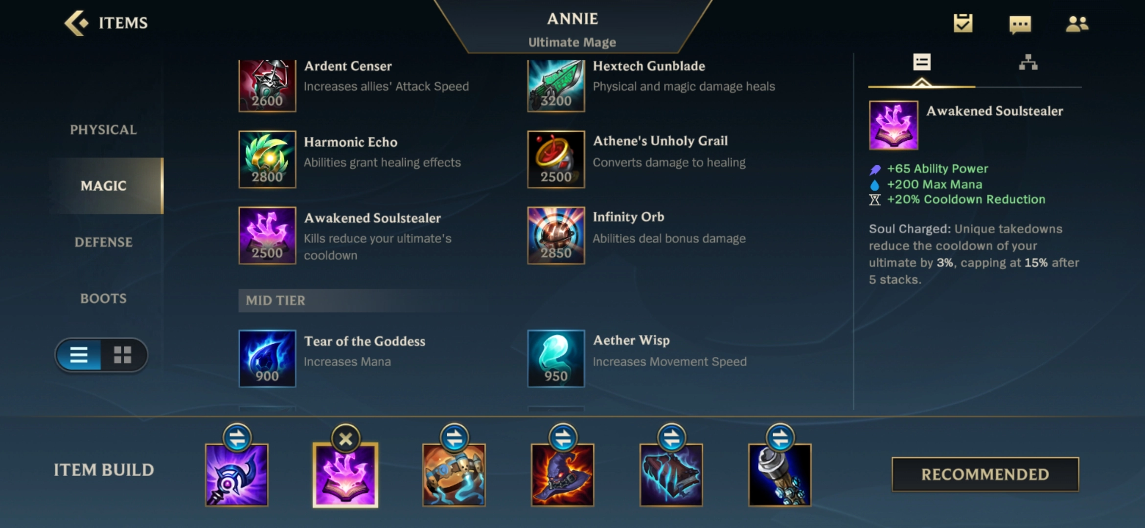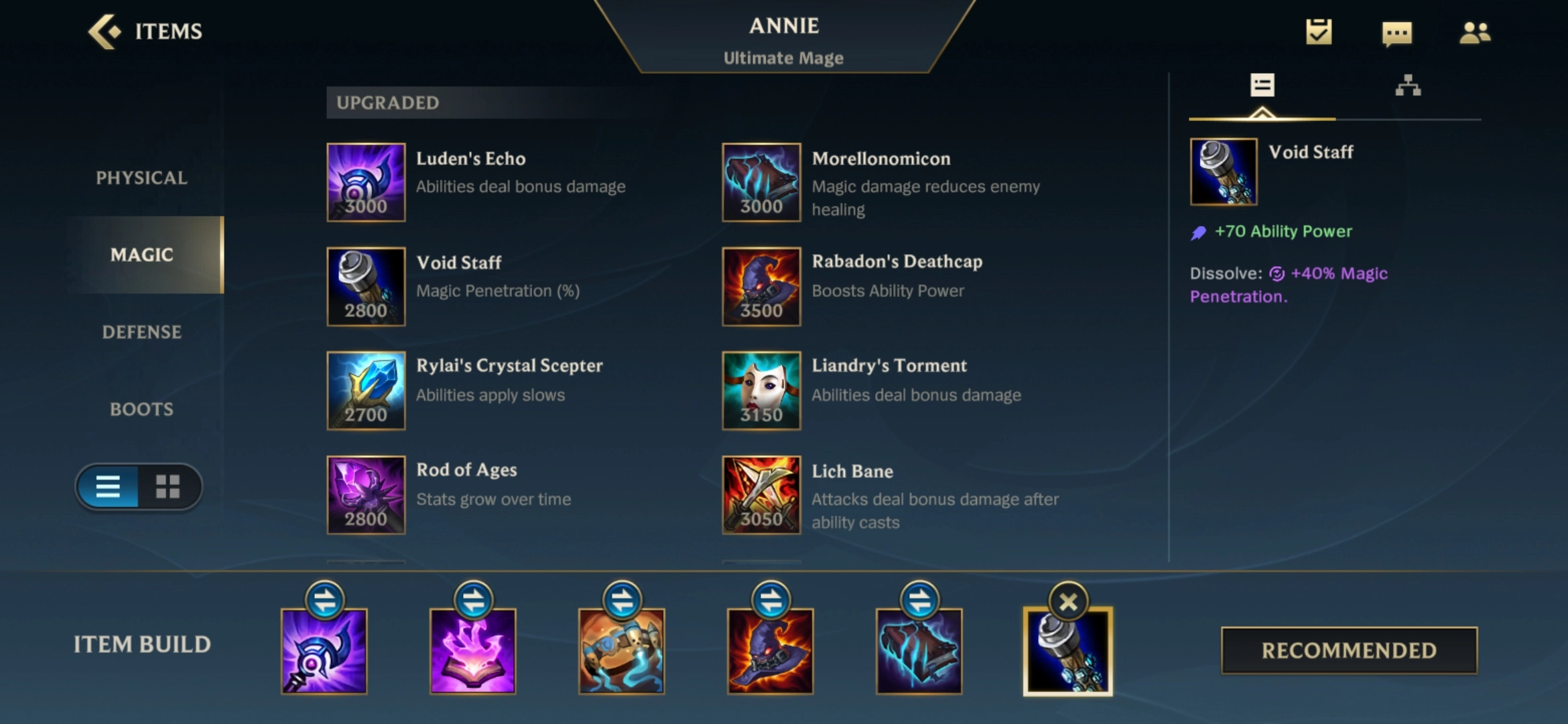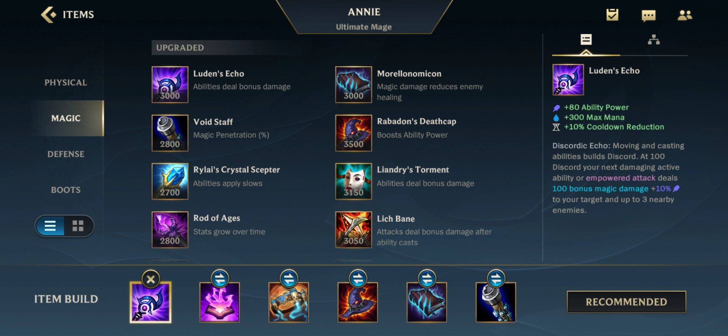 安妮常用的装备出法一般是卢登的回声(Luden's Echo)、觉醒的偷魂者(Awakened Soulstealer)、海克斯科技腰带(Ionian Protobelt)、灭世者的死亡之帽(Rabadon's Deathcap)、莫雷洛法典(Morellonomicon)和虚空法杖(Void Staff),这个顺序是比较常规的选择。