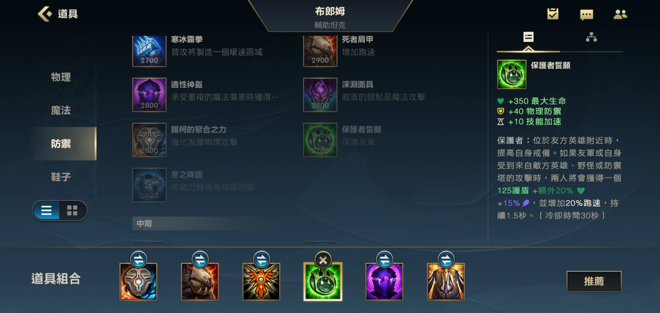 第四件装备我们选择保护者誓约,这件装备能在自身或队友遭受攻击时,为队友与自己生成一个护盾并附加加速效果,这样无论是撤离战场还是追击敌人都会更加便捷。
