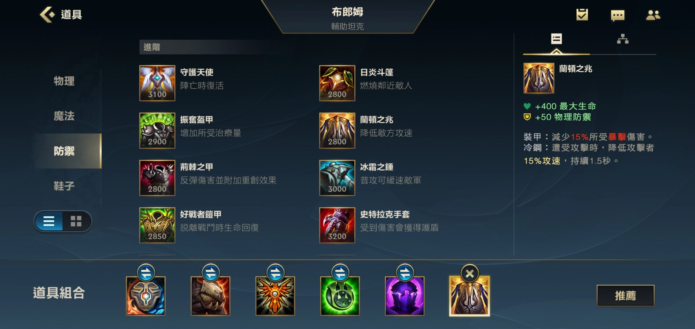 第二件装备我们选板甲。布隆作为游走能力出色的辅助,每次游走都能带来不错的效果,在小规模团战里作用也很大。出板甲能借助它的被动加速游走节奏,让自己更方便支援队友、为队伍打开局面,同时板甲本身也是件加成可观的肉装。