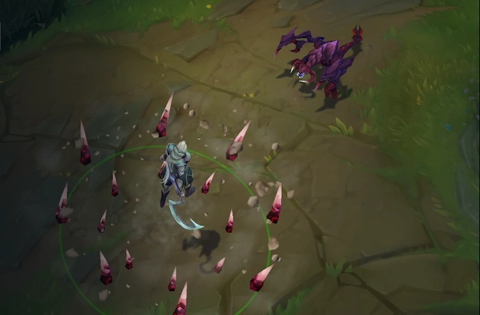 当前版本大虫子的强势阶段通常集中在大招搭配永霜的时期,由于这个版本大虫子大招的斩杀线格外长,所以一旦在没防备的情况下被它用Q技能击飞,就很容易被直接击杀。对线时甚至可以选择不补刀,也绝不能被它的Q技能命中,要是被大虫子压制住,就连补塔刀都会变得非常困难——毕竟这个英雄开启E技能后,平A会带有一定的飞行距离。