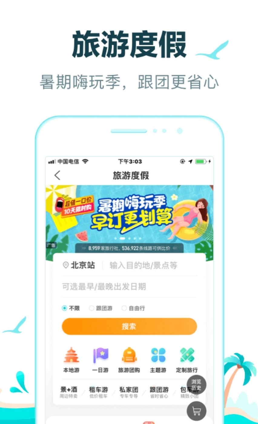同程旅行是新一代热门旅游平台,有着详细的国内游线路线,想要自驾游的小伙伴无需自己制定攻略,就能享受到一场尽兴的旅游,而且还可以在这里直接租车。