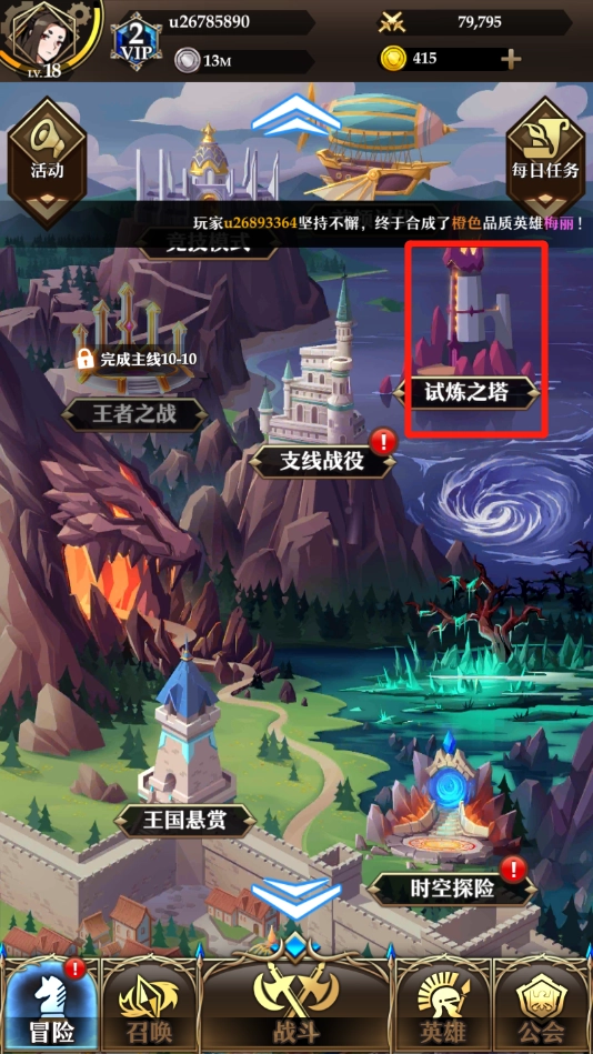 1、试炼之塔:每通过一层试炼之塔都可获得英雄徽章,爬塔层数越多,每次得到的英雄徽章数量就越多。需要注意的是,试炼之塔不会重置,在游戏初期获取英雄徽章的速度会相对快一些。