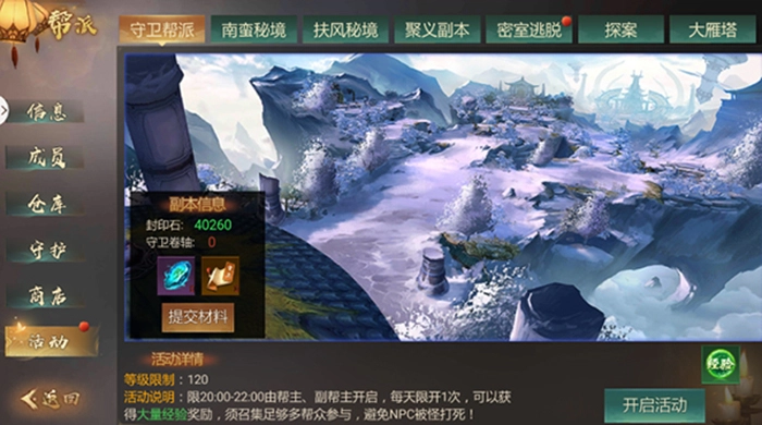 帮派内部成员完成所属帮派的具体任务后,将封印石提交给上级,当天晚上就能开启帮派活动。