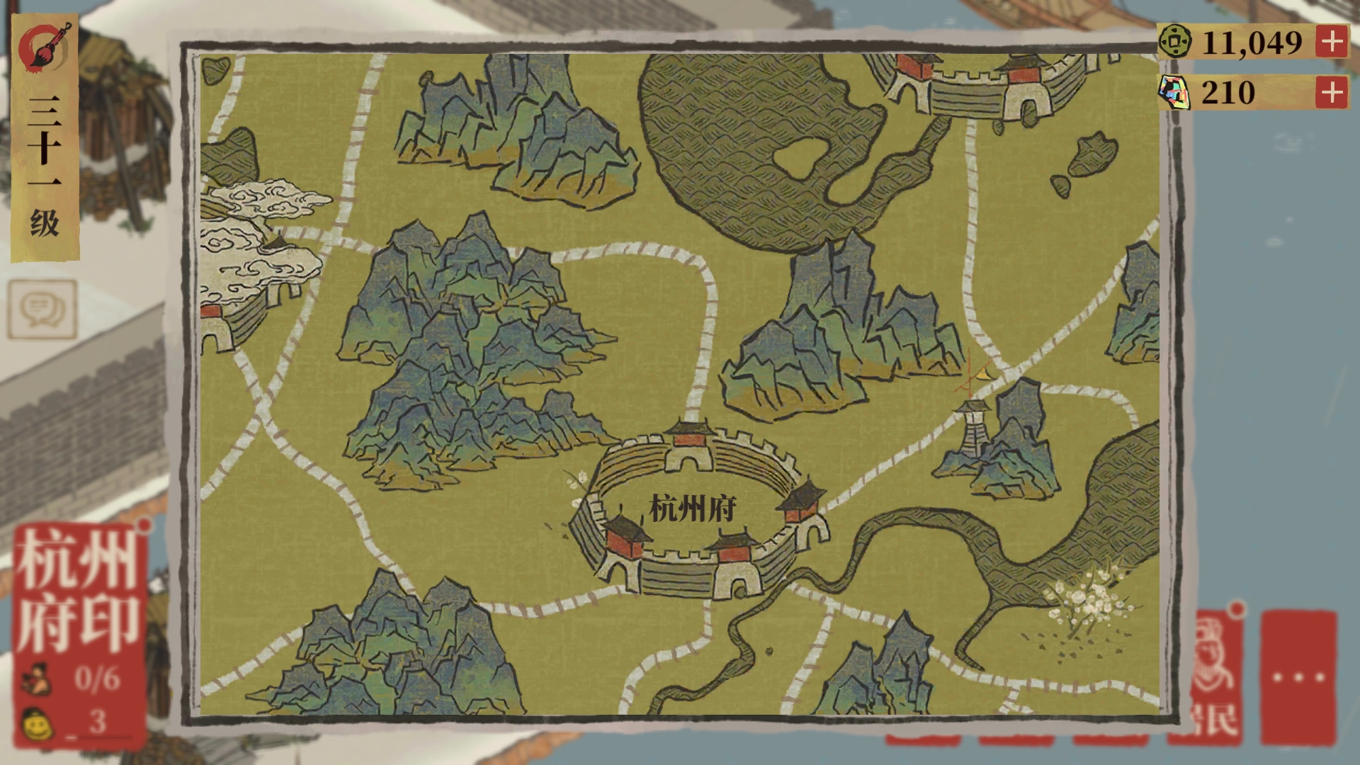 2、在苏州府的驿站里,选择外出探险并进入“阊门”。每次探险会消耗一个粮草。阊门的探险任务是:文徵明挥毫绘制妻子的画像,《江南百景图》中藏有玄机。这里的探险包含四十八个小任务,另外还有两个需要自行寻找的宝箱和钥匙。当大家完成这四十八个任务后,就能解锁杭州府的建造权限了。