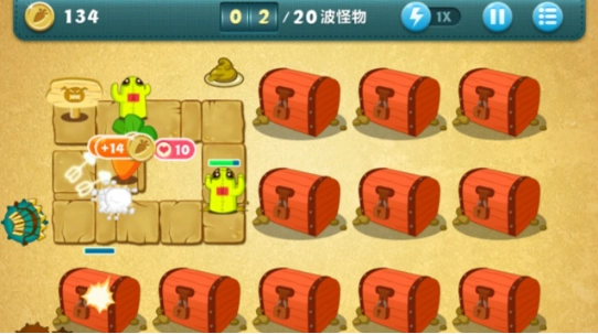 为了争取更多时间攻击宝箱,可以在上方靠近怪物的位置放置一个能减慢其移动速度的物品。这个便便造型的装备挺实用的,它不仅能延缓怪物的进攻节奏,还具备不弱的攻击力,用来抵挡前几波怪物基本不成问题。