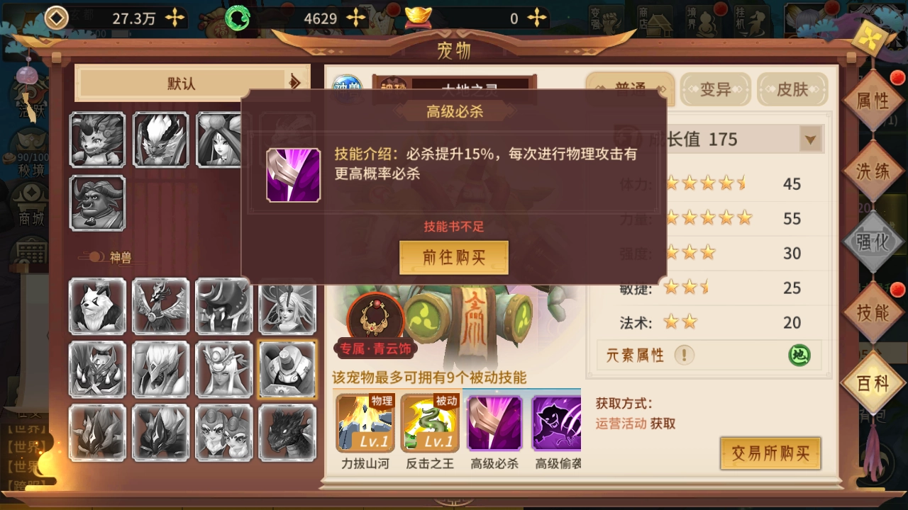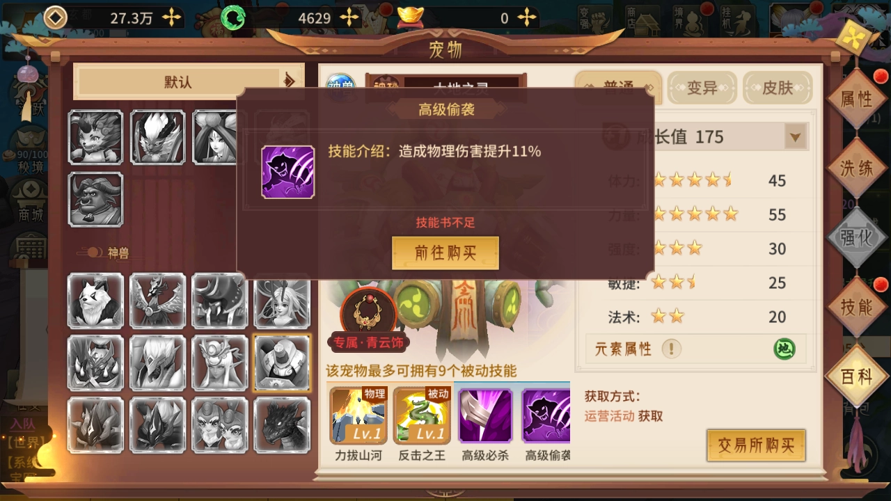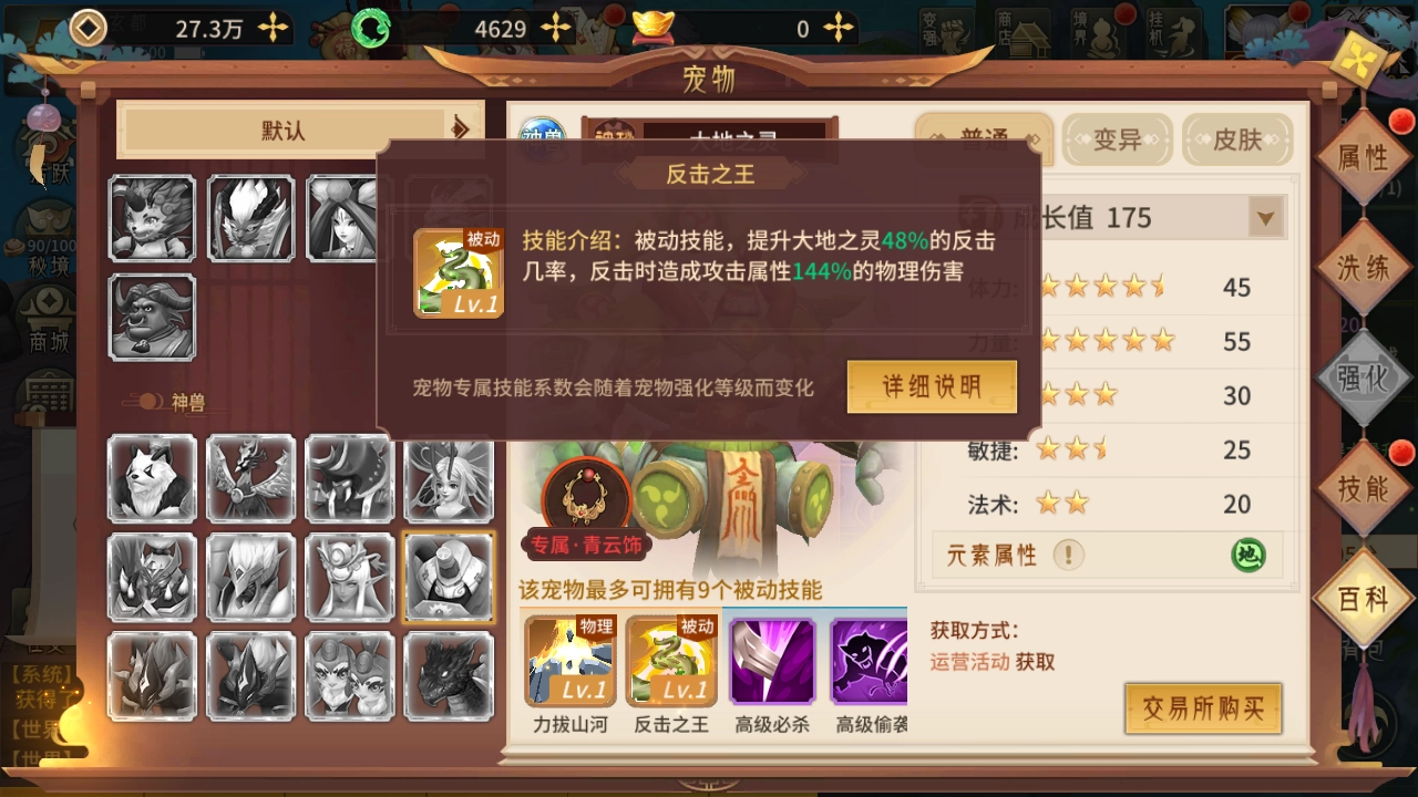 大地之灵这只宠物的技能配置相当强势,除了拥有两个专属的自带技能外,还额外配备了两个高级技能,通常这两个高级技能为必杀与偷袭。作为神级宠物,它最多能获得九个被动技能的强化效果,在实际战斗里能带来可观的属性增益。