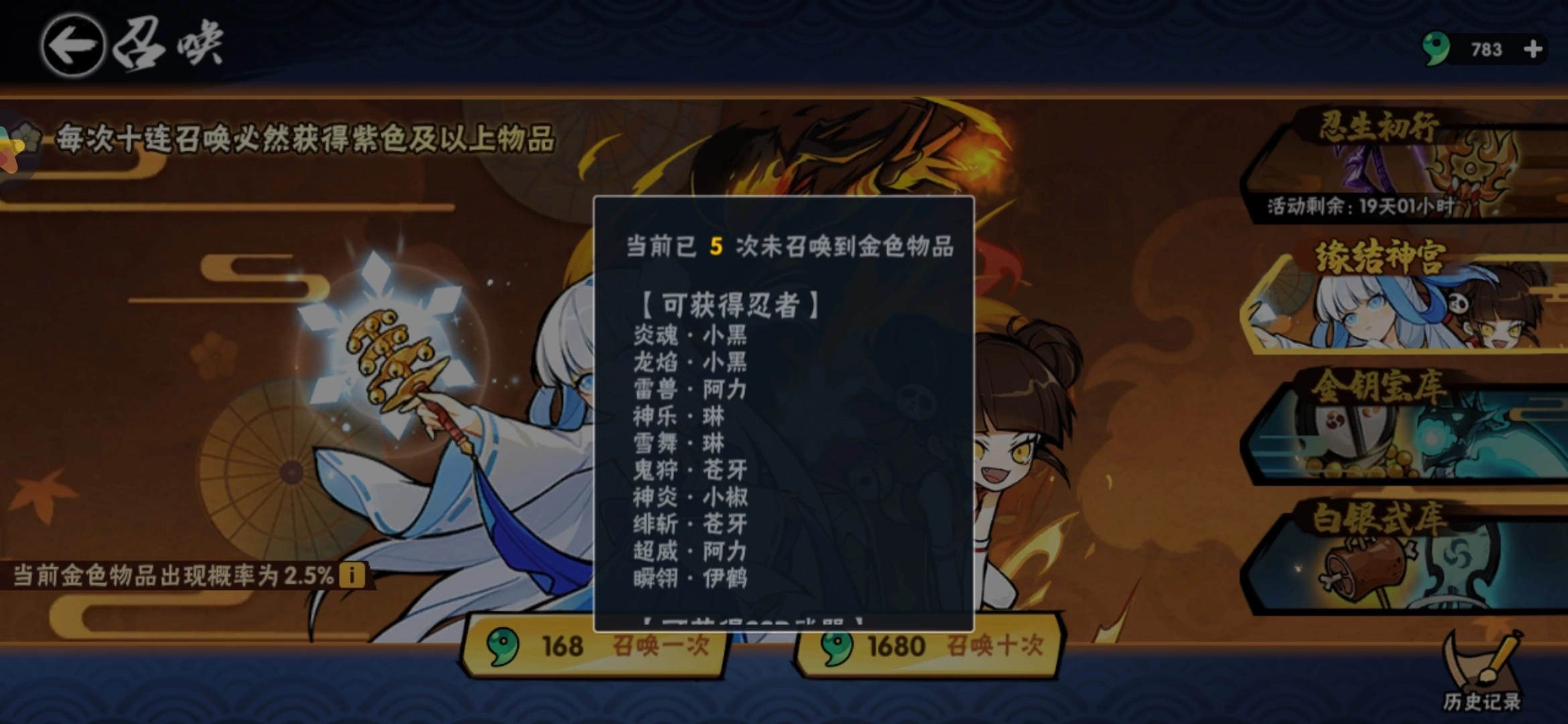 我们打开忍者必须死3这款手游,找到游戏界面下方的召唤按钮并点击,接着选择缘结神宫这一召唤场景,就有机会召唤出绯斩苍牙这个角色。