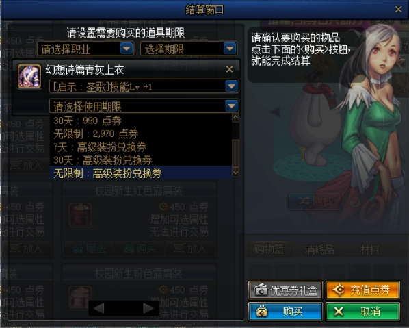 3. 点击“购买时装”后,会弹出属性选择与支付相关的选项。选好属性后向下滑动页面,就能看到使用期限的选择项(这属于支付环节的内容)。找到最下方标注有“高级或普通装扮兑换券”的选项,再根据你需要的期限选择对应的那一项即可。