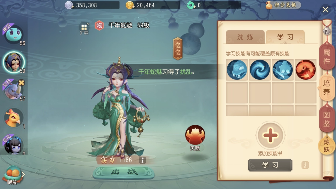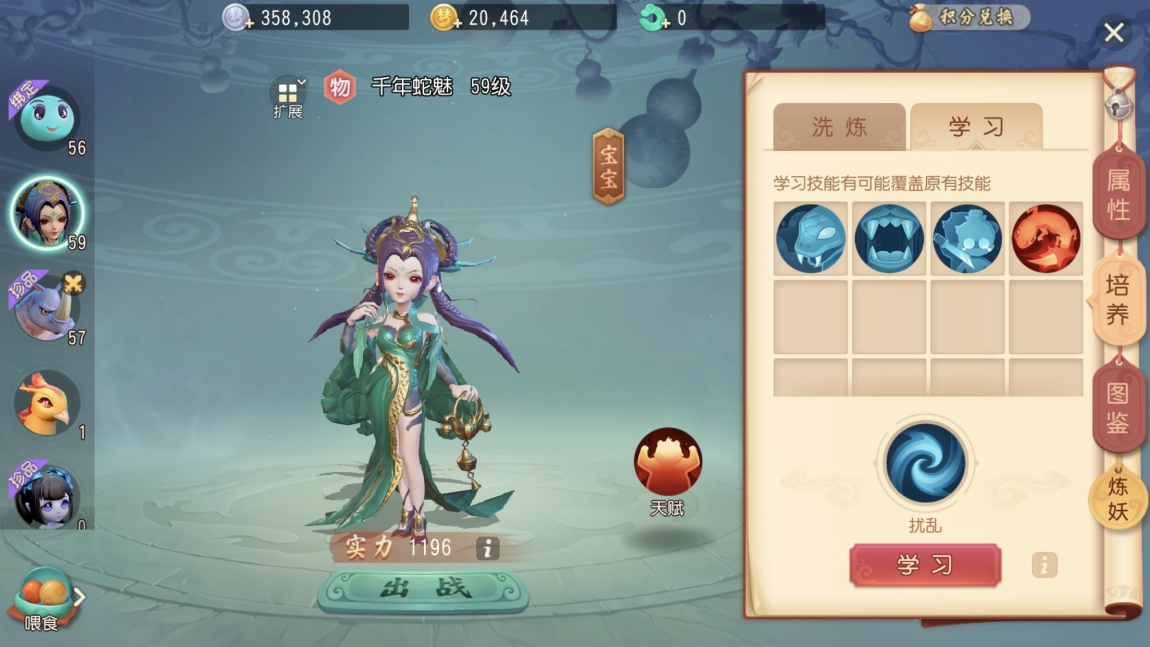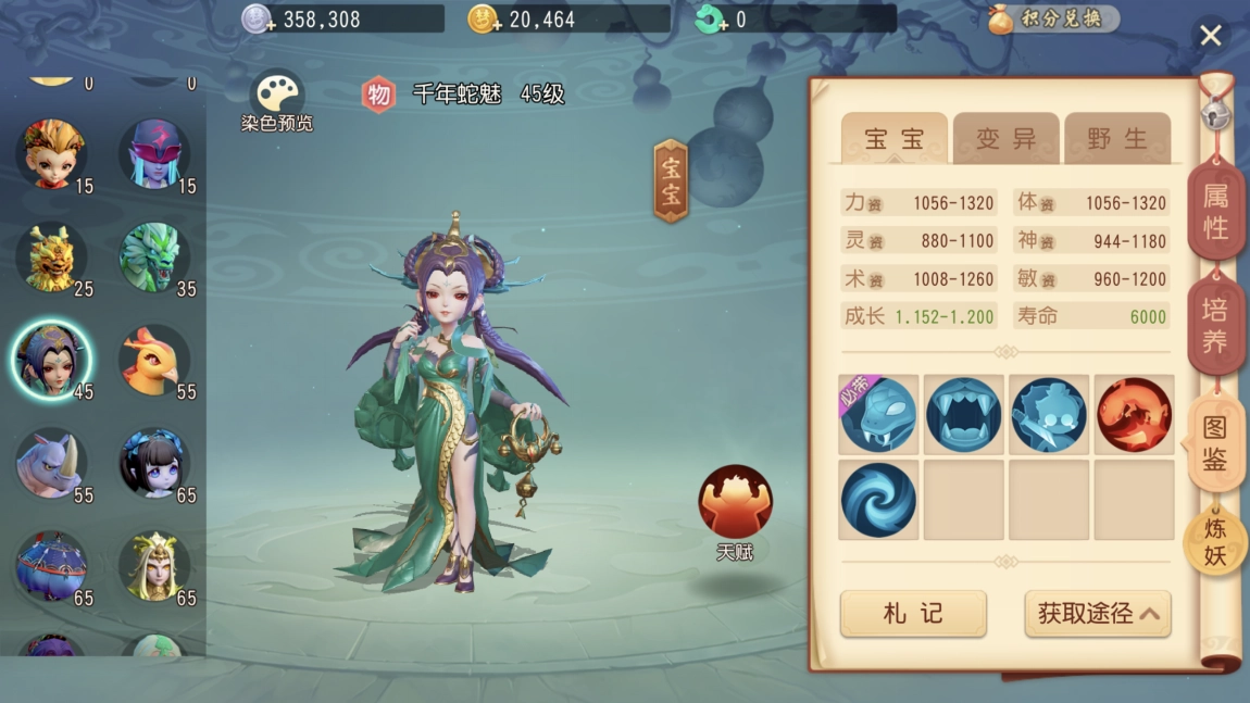千年魅蛇宝宝拥有暗夜倾城天赋,自带必有毒技能,还能随机领悟吸血、偷袭、高级再生、扰乱这五个技能。无论是捕捉到的野生宝宝,还是经过洗练的宝宝,它们的技能生成机制都是随机的。要是哪只宝宝天生就把这五个技能全部集齐,那它绝对是一只价值连城的珍兽宝宝。