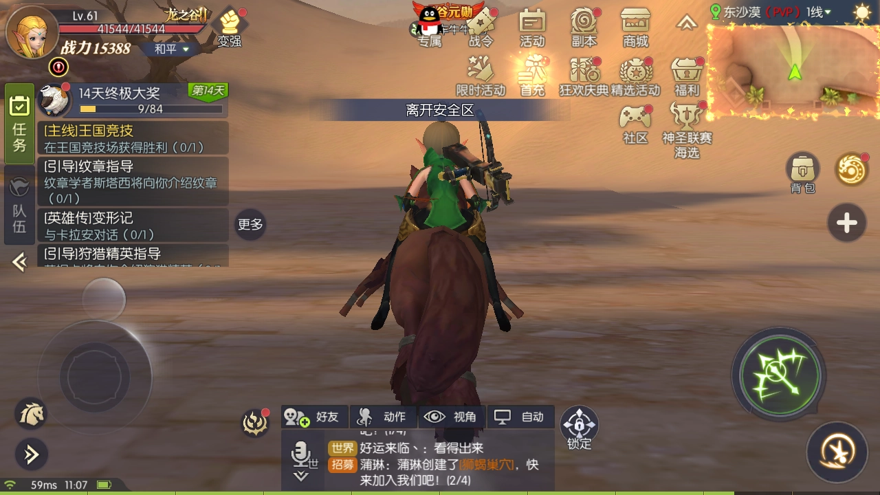 在游戏里,大型野外PK地图往往是解决公会恩怨的理想场所,龙之谷2手游中同样设有这样的野外PK地图,它的名字叫东沙漠。在东沙漠中,玩家们能够自由攻击其他玩家,并且这里没有等级限制,无论多少级都可以进入。前往东沙漠的操作也十分简单。