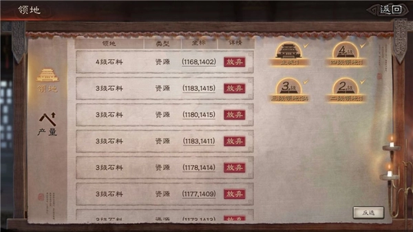 必须每天购买策书。由四千名士兵组成的队伍要开启四级地面。建议先打开四级石头,再进行石头收集。在三级地面完成作战后,第一队和第二队以低战损晋升至三级地面,为低战损挑战四级地面做准备。军屯满二十四小时后,若战斗力尚可且士兵战损较低(控制在三百点以内),就去攻打十块四级地。