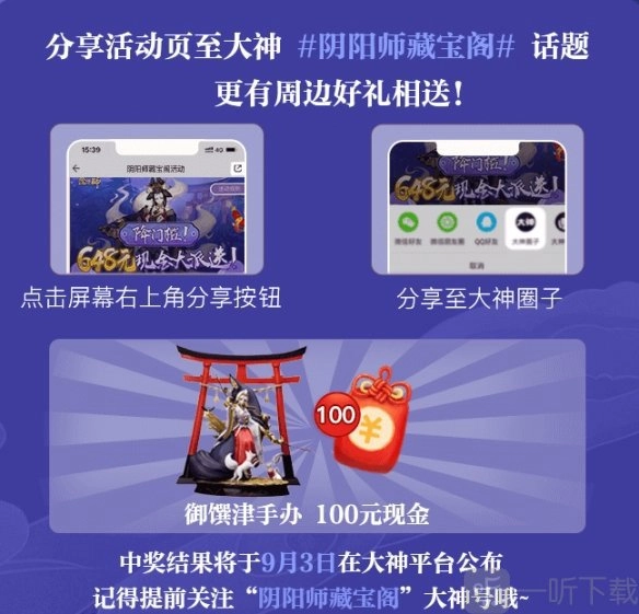 在活动开展期间,只要把活动页面分享到大神的#阴阳师藏宝阁#话题之下,就能参与分享彩蛋奖的活动,有机会赢取御馔津手办,或者获得100元现金奖励。中奖结果会在9月3日于大神平台进行公布。