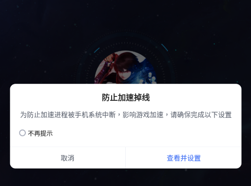 进入加速界面后,系统会提示首次使用加速功能的玩家进行系统设置。这是由于手机系统可能会中断Biubiu的加速进程,从而影响游戏体验。为避免此类情况,玩家需点击“查看并设置”,按照指引逐步完成相应的简单设置操作。