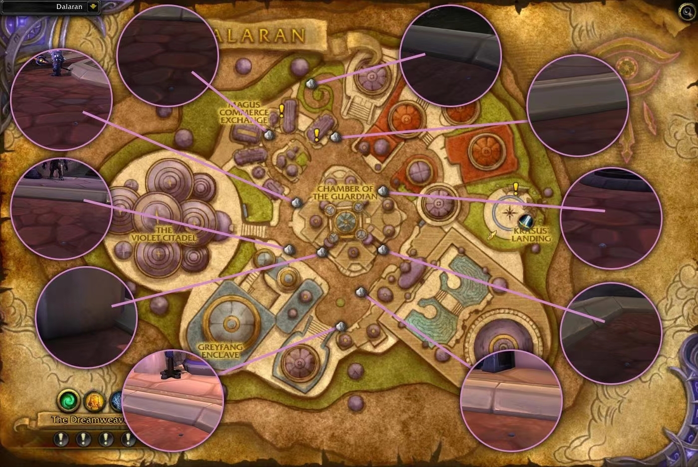 最后还有一个办法是先抵达龙骨荒野,接着前往水晶之歌森林,在地图里找到紫罗兰看台,从这里就能直接传送过去。当然,像使用火箭靴或者猎人的滑翔机这类小技巧,这里就不再详细说明了。达拉然主城中有大量NPC,能提供各类功能性服务,这也是游戏后期十分重要的内容,不管是兑换装备还是提升声望,都需要花费不少时间去处理。