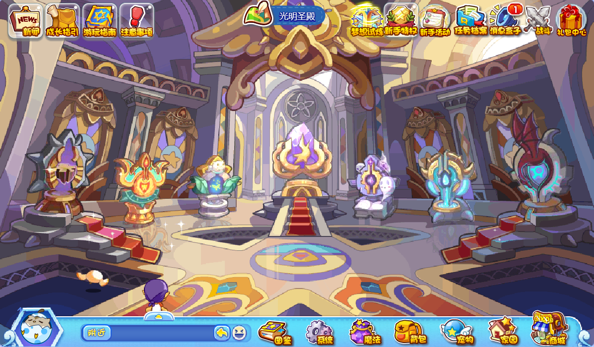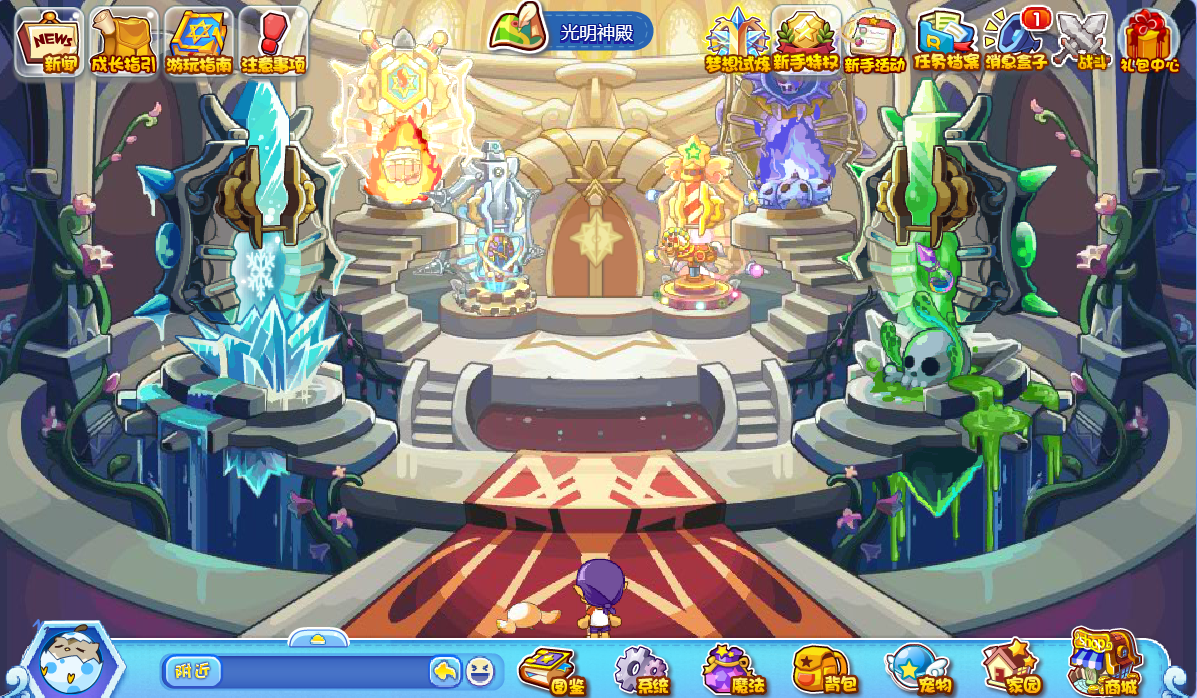 踏入光明神殿,左右两侧分布着冰晶空间、武斗空间等多个不同的空间区域。其中,萌萌空间与机械空间之间设有一扇大门,推开这扇门便能进入光明圣殿。
