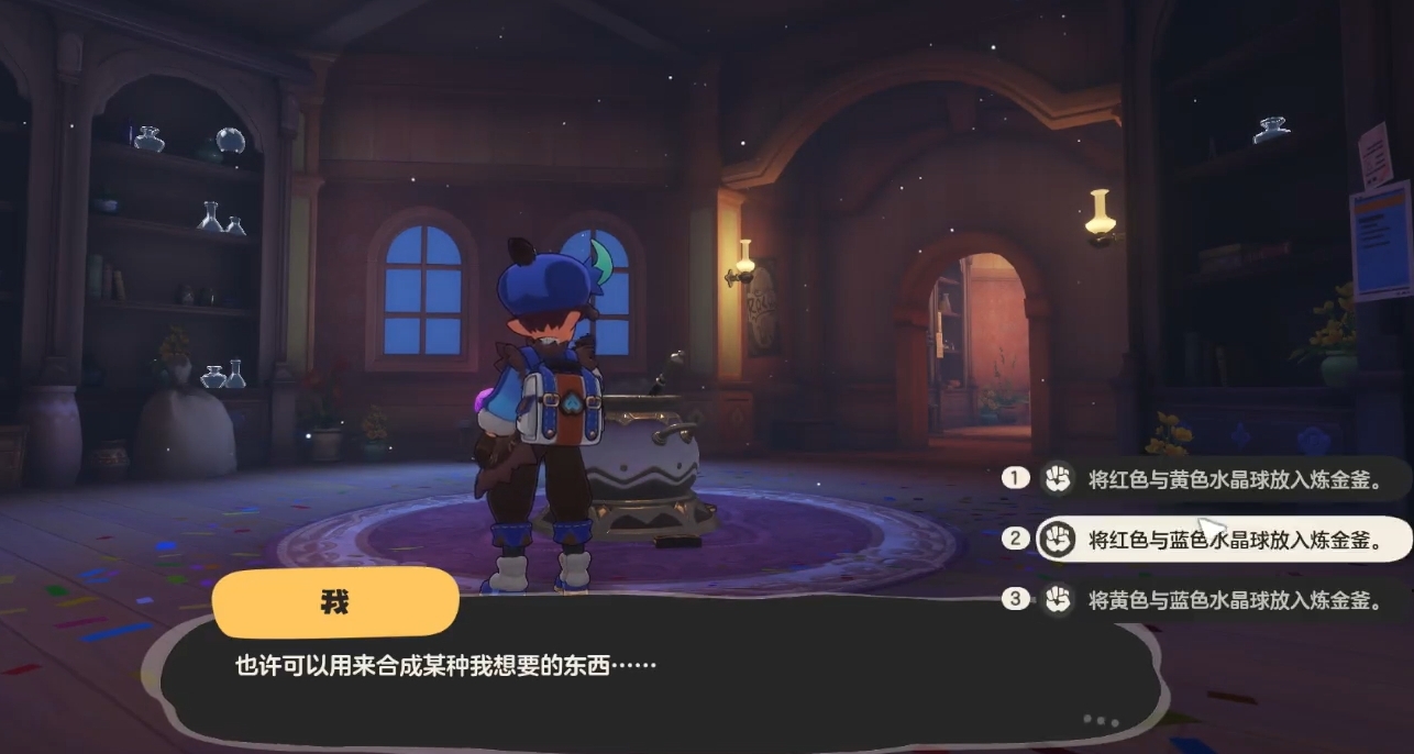 这个秘境的核心玩法是提交特定水晶球来解锁机关。首个房间需用到黄色水晶球,大家可以在后方架子上找到它,拿到后就能启动机关进入第二个房间。第二个房间要提交紫色和绿色水晶球,玩家可以先把房间里的水晶球全部收集完,接着在炼金壶中用红色与蓝色水晶球合成紫色,用黄色与蓝色水晶球合成绿色,这样就能顺利通过关卡了。