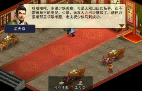 成功帮村民解完毒,玩家就能前往无双山庄。到了那儿,可以找负责报名的曲华裳,在她那里报完名后,就等着无双大会开启。随后大会正式开始比赛,除了和其他对手对抗,还得在游戏里斗鸡。虽然玩家第一轮斗鸡没拿到好成绩,但可以用游戏里的一些道具来提升这只鸡的战斗力。