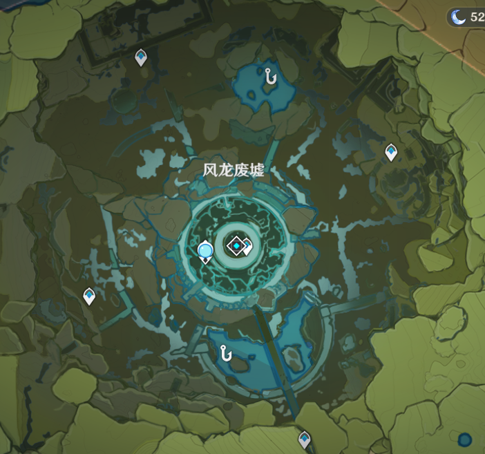 1-2:风龙废墟的正北方与正南方分别存在一个钓鱼点,通过地图能够清晰地看到两处湖区。
