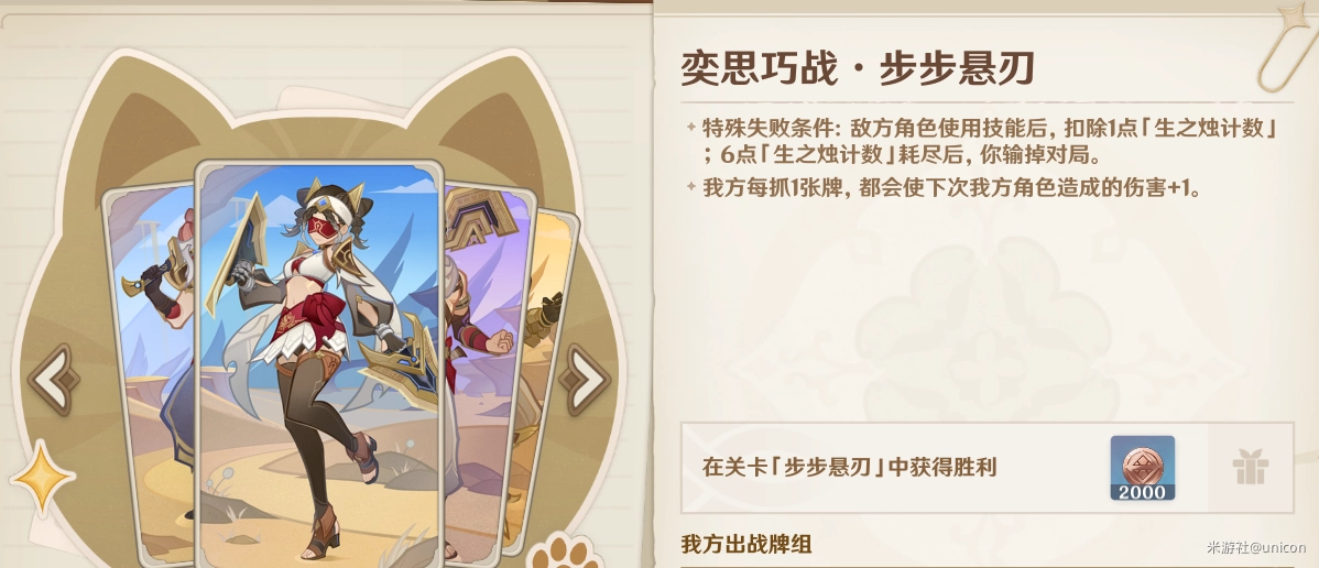 《原神》5.0版本奕思巧战的第一关名为步步悬刃,要求玩家必须在敌方使用6次技能之前取得胜利。这一关中,怪物是一波4只,比较适合使用AOE伤害来应对。此外,玩家还可以借助场地BUFF,选用娜维亚这类具备抓牌能力的角色,通过单体点杀的方式通关。