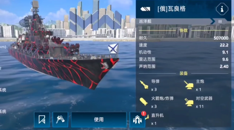 此外,瓦良格对于平民玩家而言,在游戏初期是极为适用的。该船只配备了高品质火箭炮,其对空防御能力在前期完全够用。然而,要是玩家手头缺少火箭炮,那么就不建议选用这艘船。