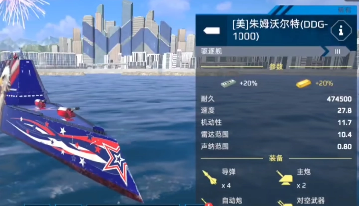 新手进入游戏后,可选择朱姆沃尔特号。该船配备四枚导弹,外观精美,耐久性也十分出色,新手前期使用完全没问题。然而,此船存在一些不足,其输出能力相对较弱,对战时防空能力也欠佳,后期需更换为其他船只。
