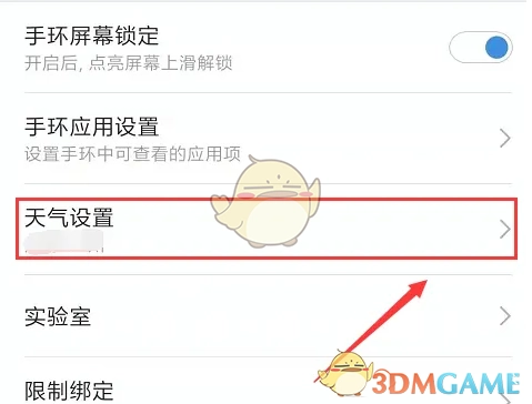 3、进入手环,找到【天气设置】,接着点击其右侧的小箭头,进入详细设置页面。