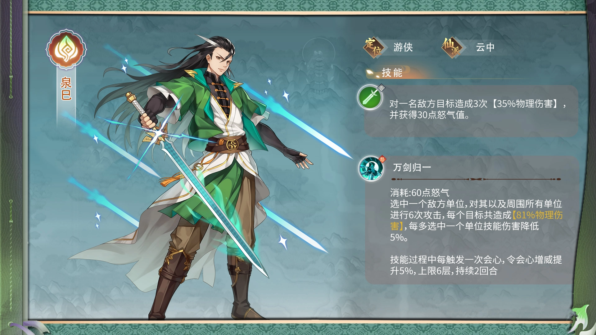 在纵横旅人这款游戏里,泉巳的定位为木属性游侠,他来自仙派云中,是云中长老酒剑仙的弟子。泉巳剑术高超,曾于褚黎之地一剑荡魔破千,因此被世人尊称为小剑仙。平日里,他过着闲云野鹤般的隐士生活,行踪颇为神秘。下面为大家呈上《纵横旅人》泉巳的技能图鉴,其中涵盖该伙伴角色的立绘、背景、技能以及秘法推荐等内容,大家一同来瞧瞧吧!
