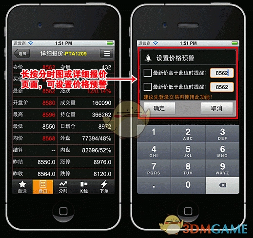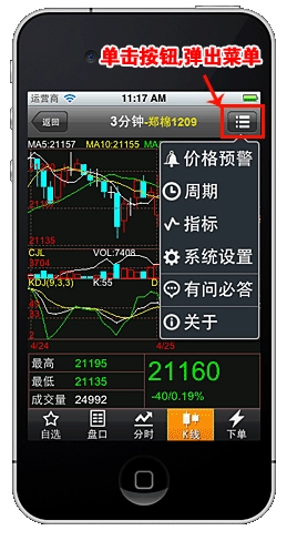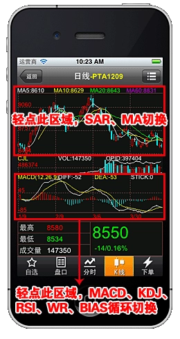 您可以查看内外盘报价、分时图、K线图以及交易界面。在K线图方面,能够选择各类常用周期,并且还能显示MA、SAR等常用指标。只要期货公司为您的资金账号开通了文华财经一键通权限,便能够运用本程序进行下单操作。