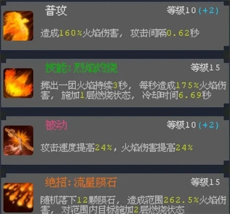 重点注意:绝招“流星陨石”务必点满至15级,达到三阶时会提升全属性加成效果。