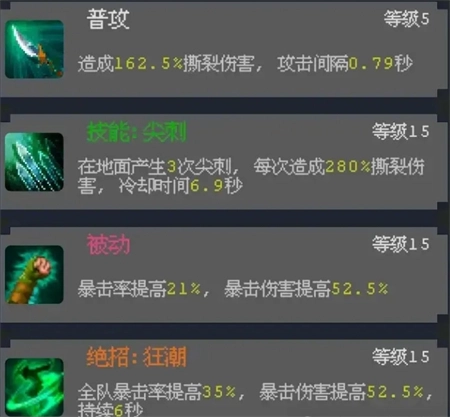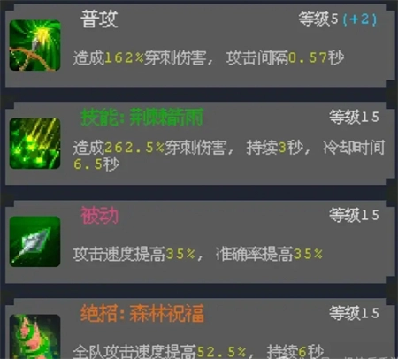 加点建议:首先将绝招「森林祝福」(15级)升至满级,此操作可使全队攻速提高52.5% 。