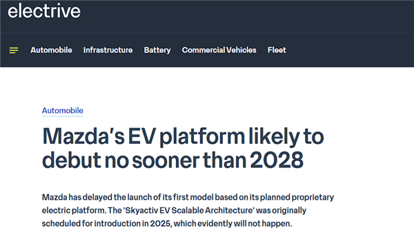 1月15日消息显示,马自达原本打算最早在去年推出其首款基于自由纯电平台的Skyactiv EV Scalable Architecture,但最终未能达成这一既定目标。