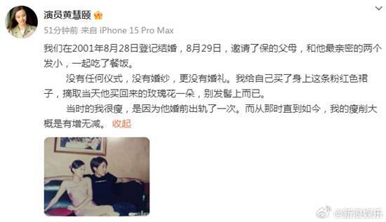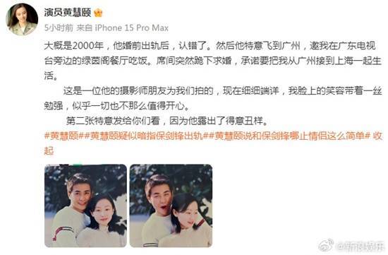 黄慧颐表示,她与保剑锋在2001年8月28日登记结婚,当时行事非常低调,只是双方父母和亲密朋友一起吃了顿饭,并没有举行公开的婚礼。更引人关注的是,她指出保剑锋在婚前(大约2000年到2001年期间)有过出轨行为,之后还特意到广州向她下跪求婚。为了证明自己的说法,她还展示了当年求婚现场的合影。黄慧颐还把这次爆料和自己的经历联系起来,称最近几年因为不断爆料,受到保剑锋和他现任妻子的恶意举报,使得她的直播间账号被封禁,并且怀疑这件事和保剑锋的新剧《太平年》定档在1月18日播出有关联,认为对方是为了宣传新剧而压制她的声音。