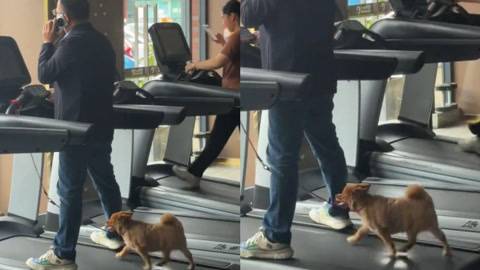 画面中,一只小狗在跑步机上气喘吁吁地持续奔跑,而它的主人却插着兜打电话,全程未参与运动。
