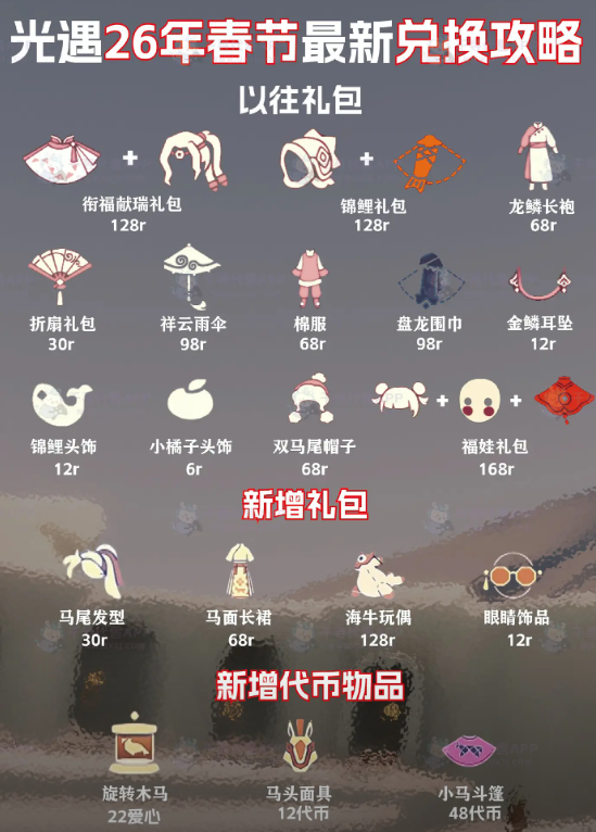 在《光遇》里,官方最近分享了一些春节相关的游戏内容,这次的消息涵盖了往年春节返场的物品以及马年新推出的道具等。下面是小编为大家整理的2026年春节最新物品兑换图的详细汇总,感兴趣的玩家快来瞧瞧这次都有哪些物品吧!