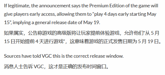 没过多久,外媒VGC也发布文章报道了这一消息,并且提到,其消息来源已经向他们证实,这个日期确实就是准确无误的发售日期。