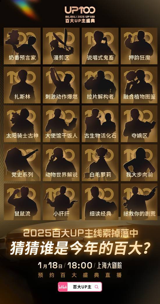 作为2025百大UP主预热活动的组成部分,B站近期接连公布了三批新百大UP主的剪影与线索关键词。细心的网友很容易从这些线索里推测出部分知名UP主,像小约翰可汗(线索为“几个通辽”)、王老菊(线索是“太阳骑士古神”)、蔡明老师(线索“白毛萝莉”对应的是她的Vtuber形象)等。