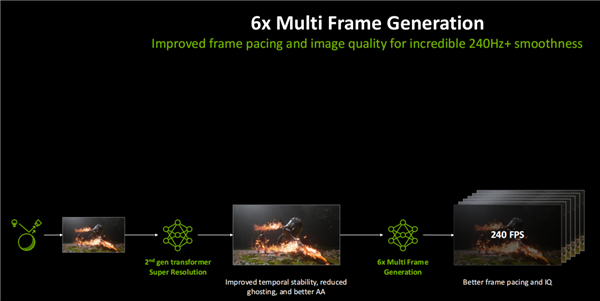 同时,DLSS 4.5搭载了全新的动态多帧生成技术,相较于DLSS 4所实现的4倍多帧生成,该技术最高可支持6倍多帧生成,能够显著提升游戏运行的流畅度;此外,它还可依据当前显示器的最高刷新率设定,以该刷新率作为帧率输出目标,对多帧生成进行实时动态调节,从而使最终呈现的帧率与显示器的刷新率设置保持同步。