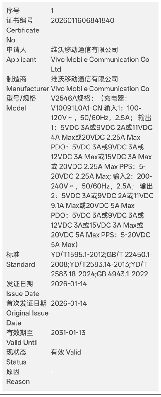 今天,iQOO 15 Ultra这款新机型已正式通过3C认证,对应的型号为V2546A,并且具备100W有线闪充功能。