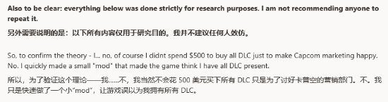 他还反复说明,这个MOD其实并未解锁任何游戏内容,他本人也不鼓励大家在游戏里使用这类MOD。与此同时,他提到自己已经把相关情况反馈给了卡普空官方。要是卡普空官方对此没有回应,他就会把这个MOD以完全开源的方式发布出来。