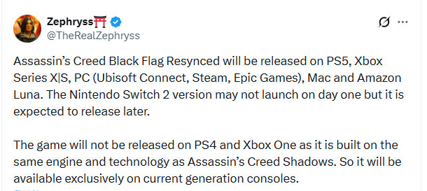 《刺客信条》系列的知名爆料者@TheRealZephryss(玩家常称其为“舅舅”)通过推文透露,《刺客信条4:黑旗重制版》计划登陆PC平台(涵盖Ubisoft Connect、Steam、Epic Games三大商店)、PS5、Xbox Series X|S、Mac以及亚马逊云游戏平台Luna。不过该作首发阶段暂不登陆Switch 2,后续则会推进向Switch 2的移植工作。