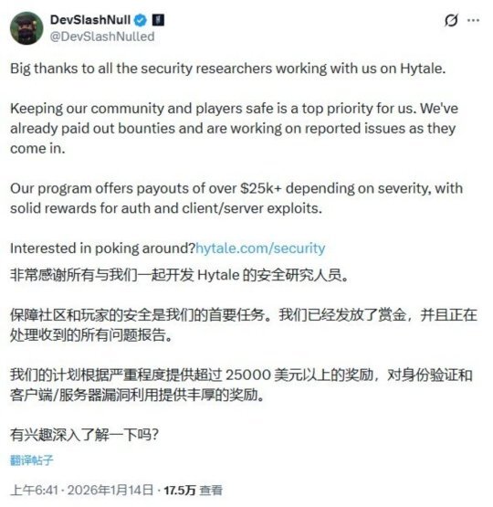 不过,和大多数早期访问游戏类似,《Hytale》的上线首周也并非毫无波折,游戏出现了一些在预期范围内的错误与技术故障。为了保障游戏的安全与稳定运行,开发商Hytale团队于近日正式启动了一项漏洞赏金计划,将为那些发现并上报安全漏洞的玩家提供总计超2.5万美元的奖励。