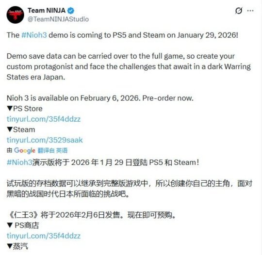 Team NINJA今日在官方社交媒体发布消息,旗下动作角色扮演游戏《仁王3》的试玩版确定于2026年1月29日同步登陆PlayStation5和Steam平台。
