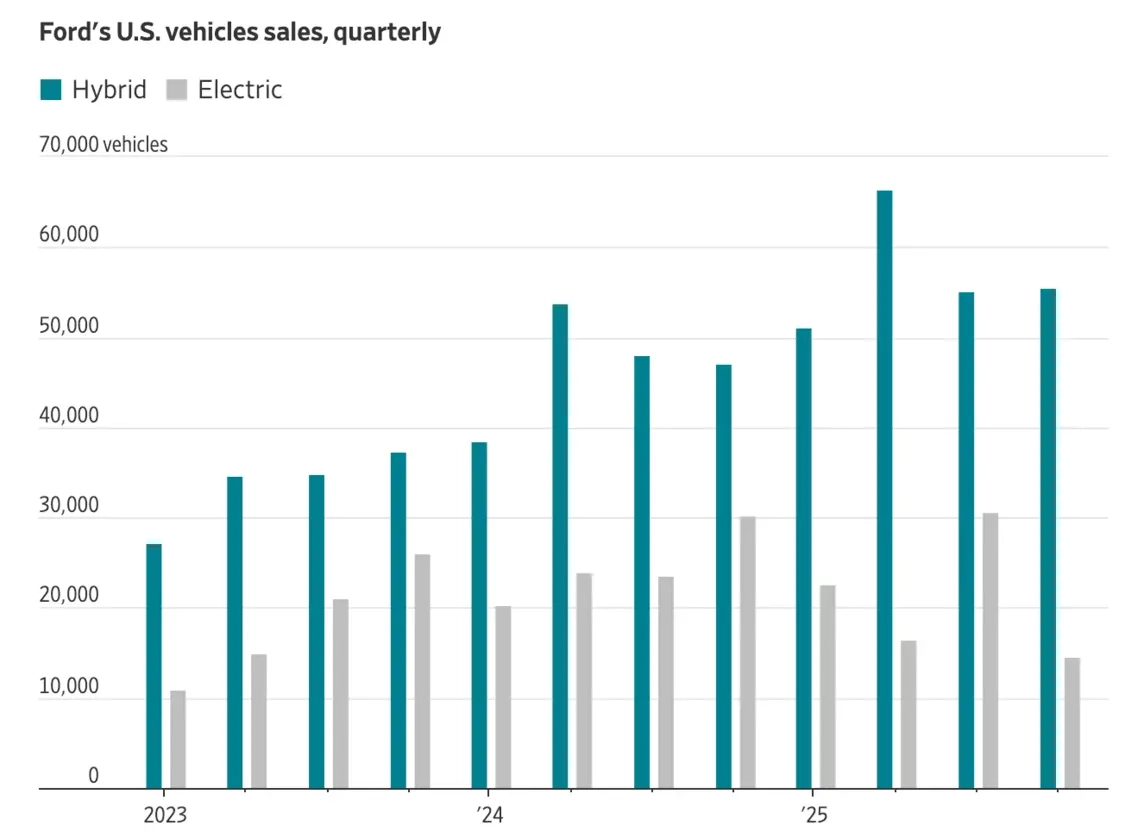 福特在上个月宣布,鉴于电动车市场需求出现下滑,公司计划调整发展战略,缩减电动车的生产规模,同时将计提约195亿美元的相关费用,这部分费用主要涉及旗下的电动车业务。此外,福特还透露,预计到2030年,其全球汽车销量里,混合动力车、增程型插电式混合动力车以及纯电动车的合计占比将达到大约一半。