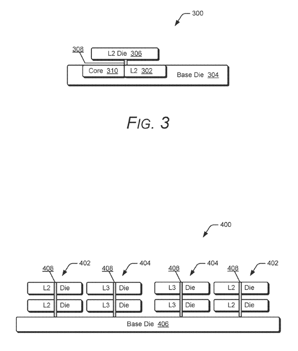 从示例图能够看出,AMD构想了一种多层堆叠的结构形式,其基础层负责连接计算核心与缓存模块,在基础层之上还可以继续叠加多层缓存Die,比如由四组512KB区域构成的2MB L2模块,并且还有进一步扩展到4MB的可能性。