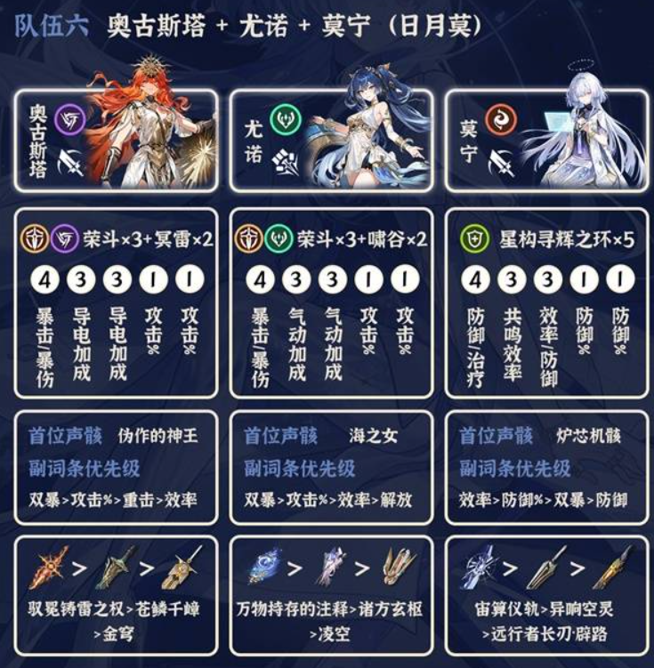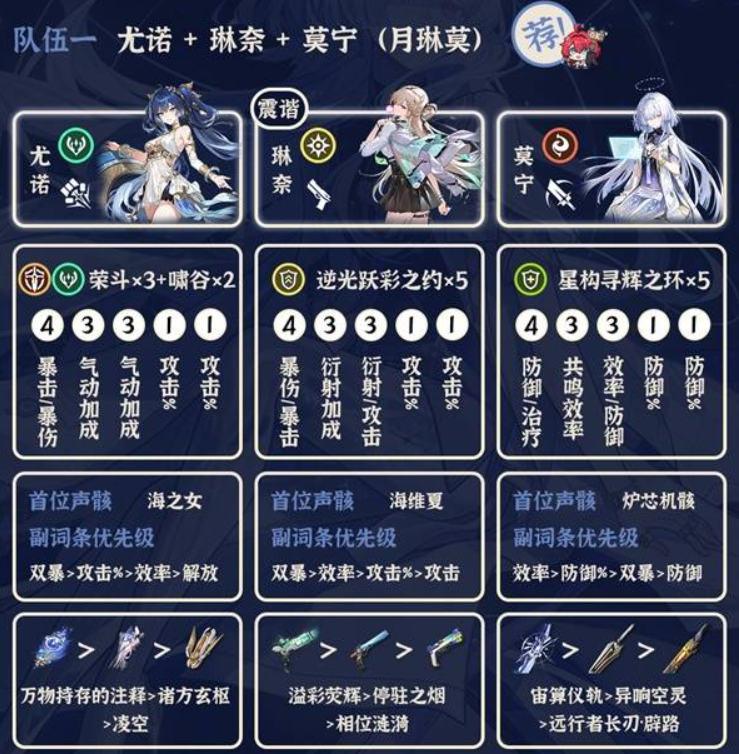 当前版本比较推荐的配队,等偏谐机制的主C上线后,就可以把尤诺换成这个偏谐主C了。