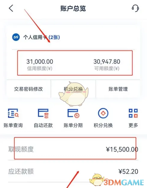 6、当进入总览界面,就能查看诸如信用额度之类的信息。