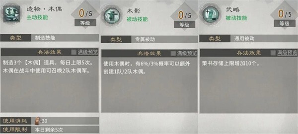 第一行:主动技能制造木偶,可用于卡位战术,推荐点满;被动技能【木影】触发概率较低,不推荐投入点数;被动技能【武略】能够提升策书上限,建议优先将其点满。