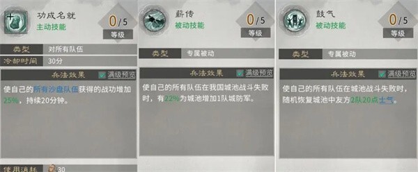 第三行:效果涵盖提升战功获取、增加城防军数量、恢复队友士气。主动技能满级时战功加成达25%,收益处于普通水平,可依据自身需求决定是否加点;【薪传】带来的城防军增长易对友军行动造成阻碍,因此不建议选择;【鼓气】的士气恢复效果则能结合团队实际需求来考量选用。